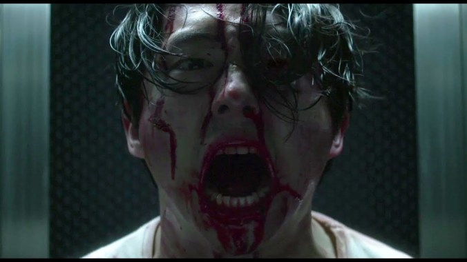 Derek himself was just as much fun to watch, before the outbreak Derek had a lot of conflict in himself, in his short time with the company he’d lost a lot of the wide-eyed optimism and some of his humanity as well, trying to hold onto the little he had with little acts of kindness. His subsequent firing might have been a blessing had he not been giving the option of accepting the fall and risk being sued by the company or losing his severance. As such when the outbreak occurs, he is more than happy to not only kill everyone above his pay-grade, but to also cheat them out of millions by exposing their dirty dealings to their clients. It’s absolutely brilliant to watch Yeun let loose and he makes Derek so easy to root for, partly in fact because unlike his bosses, Derek still maintains a level of empathy. While he has his tirades including a great moment where he delivers the terms and conditions of a fight while Faith No More plays in the background, it’s the smaller moments like his sadness over his friend’s death, or his ongoing attempts to help Melanie between the madness that endear us to him, all while he brutally kills his co-workers.